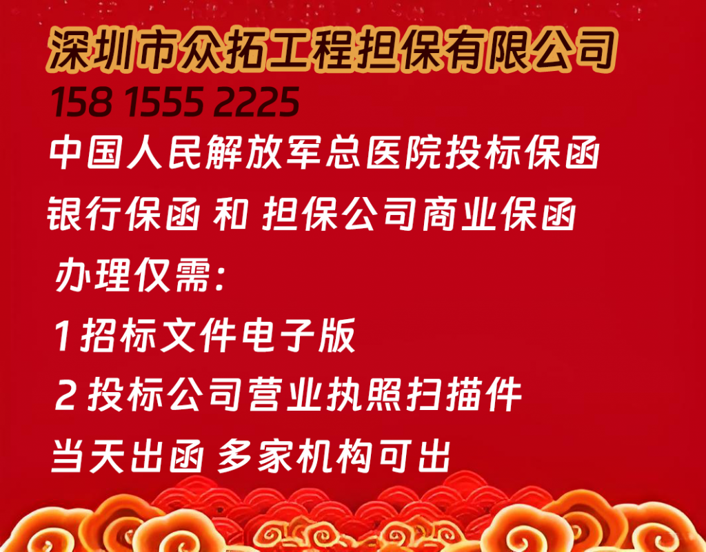 在激烈的医疗设备采购招投标竞争中,投标保函是企业参与投标的“通行证”,不仅能替代高额保证金、释放现金流,更能提升投标信用度,增加中标机会。作为专注于工程担保领域的国有独资企业,深圳市众拓工程担保有限公司凭借丰富的合作资源、极简的办理流程、高效的出函速度,成为众多投标企业办理解放军总医院投标保函的首选合作伙伴。