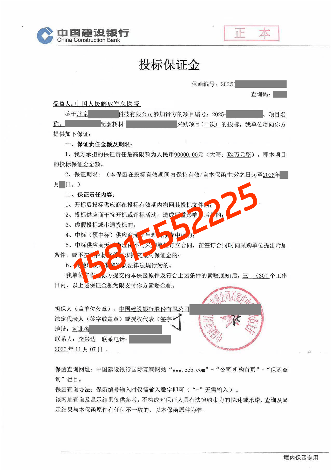 2025年11月5日,某老客户再次中标解放军总医院大型设备采购项目,特意致电公司表示感谢。该客户表示:“众拓的保函办理效率高,资料要求简单,当天出函为我们节省了大量时间,让我们能更专注于投标方案优化,这次中标离不开你们的支持!”这已是该公司今年第3次通过众拓办理解放军总医院投标保函并成功中标。